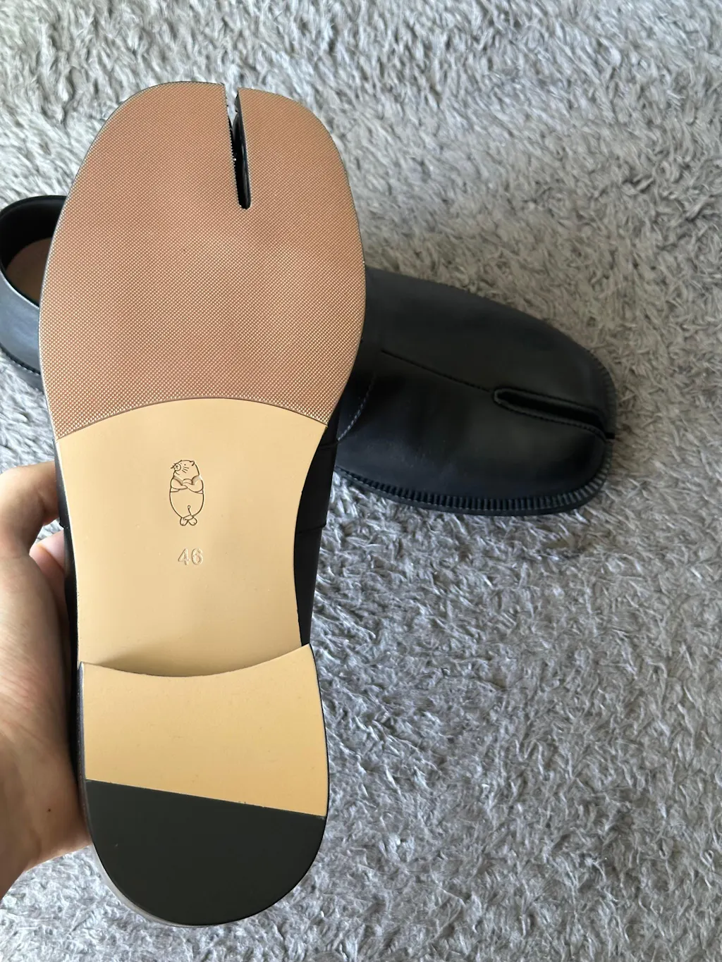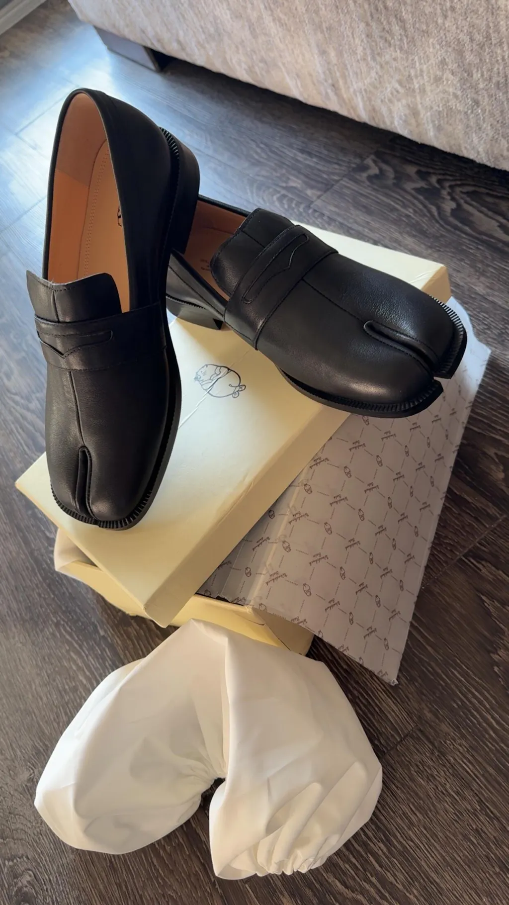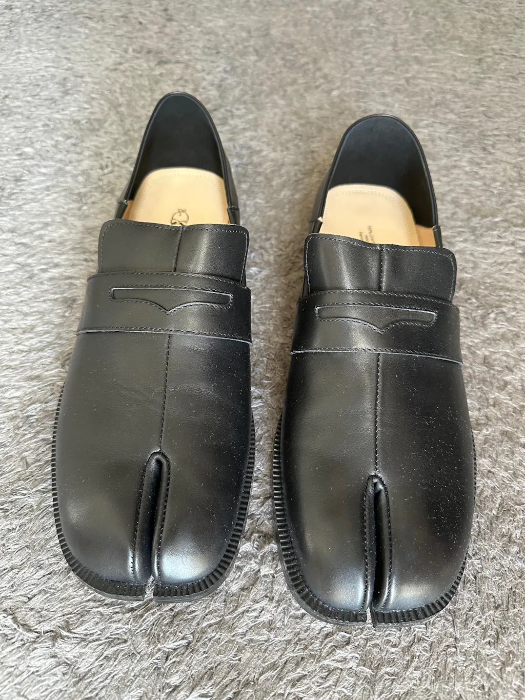 Handcrafted in smooth black cow leather, these loafers bring a refined balance of tradition and modernity. The classic penny strap detail nods to timeless loafer design, while the signature Tabi split toe adds a bold, contemporary twist. Designed with both foldable and fixed heel options, they offer versatility and comfort, making them a perfect match for anything from tailored looks to relaxed everyday outfits.