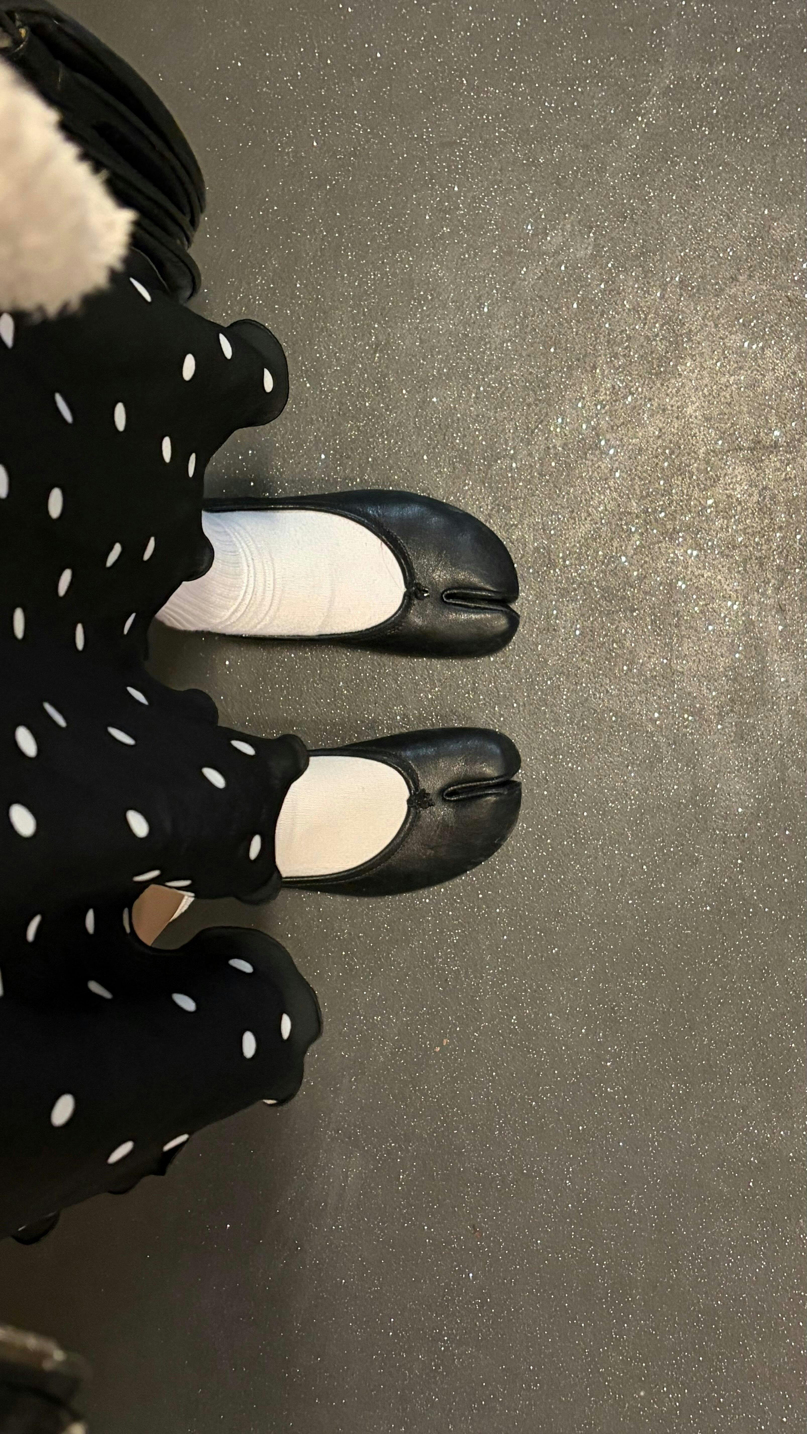 Person wearing Model displaying  Black Leather Split-Toe Tabi Ballerina Flats