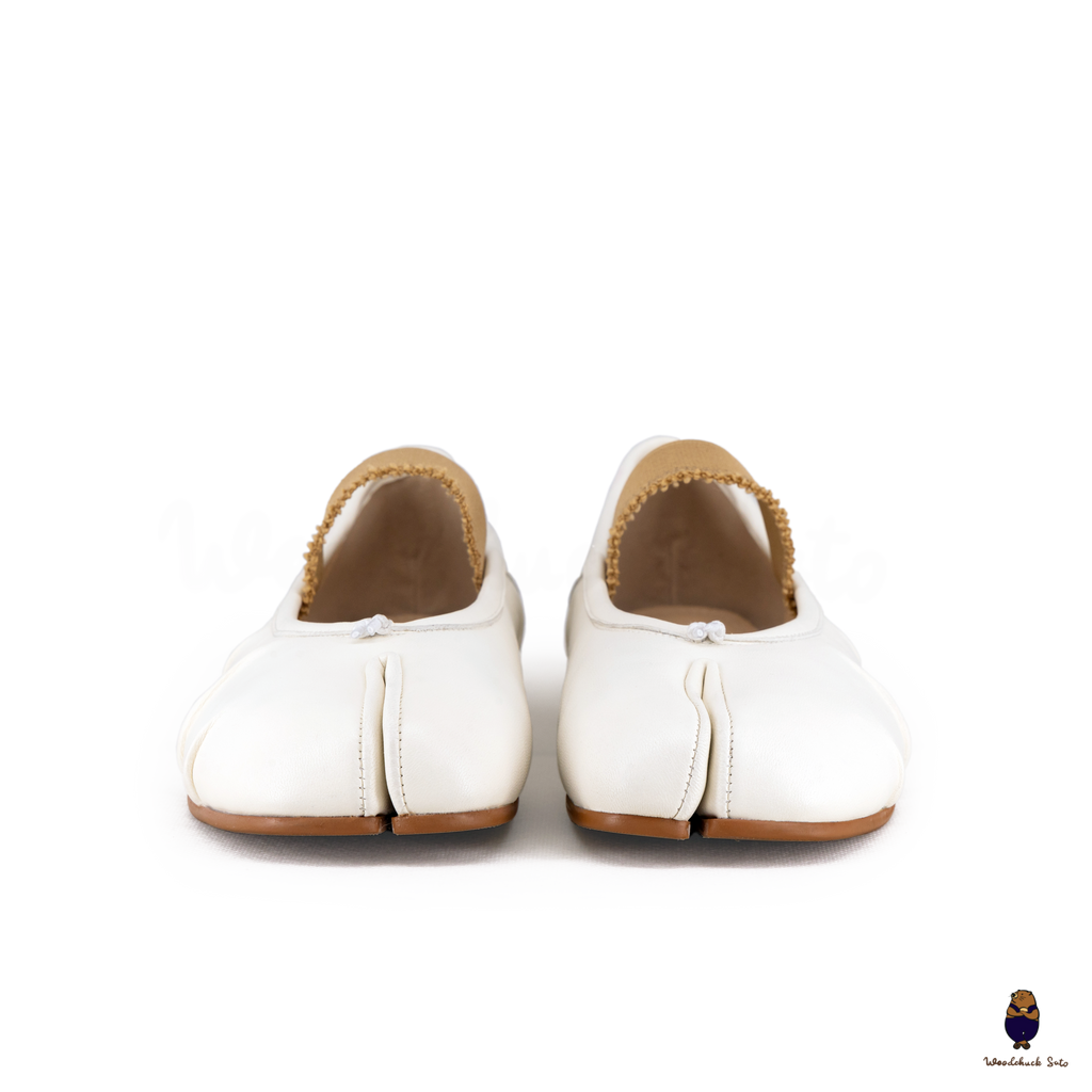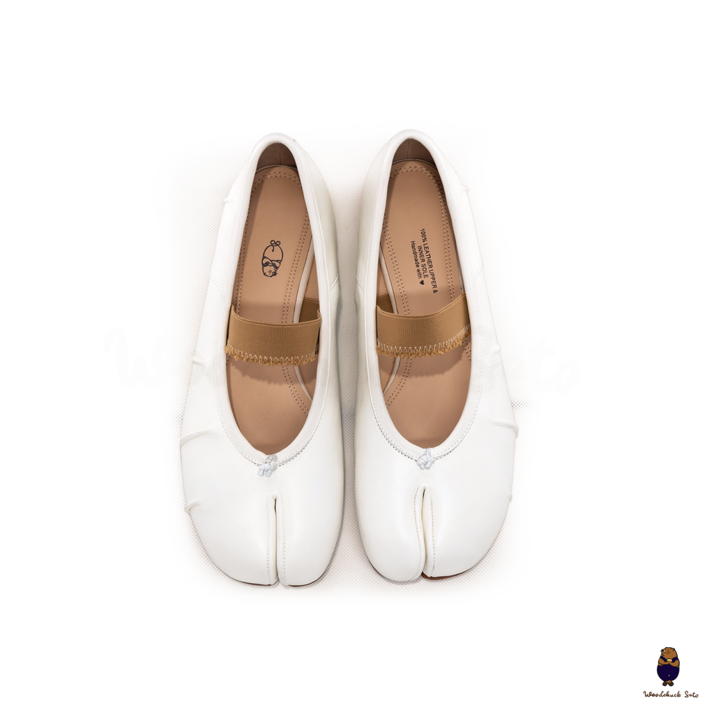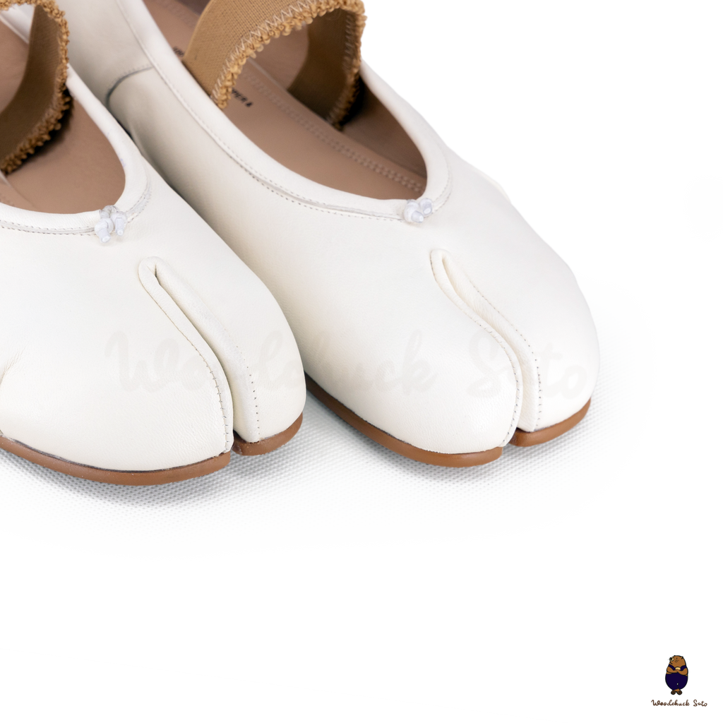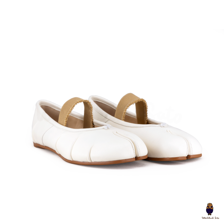 Elegant and contemporary, these white Tabi flats are crafted in supple leather and finished with ruched detailing along the vamp for a soft, textured look. The split-toe design highlights their iconic character, while the beige elastic strap offers a comfortable and secure fit. A versatile style that balances minimalism with artisanal detail, perfect for both casual wear and refined ensembles.