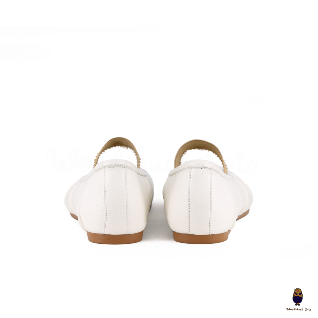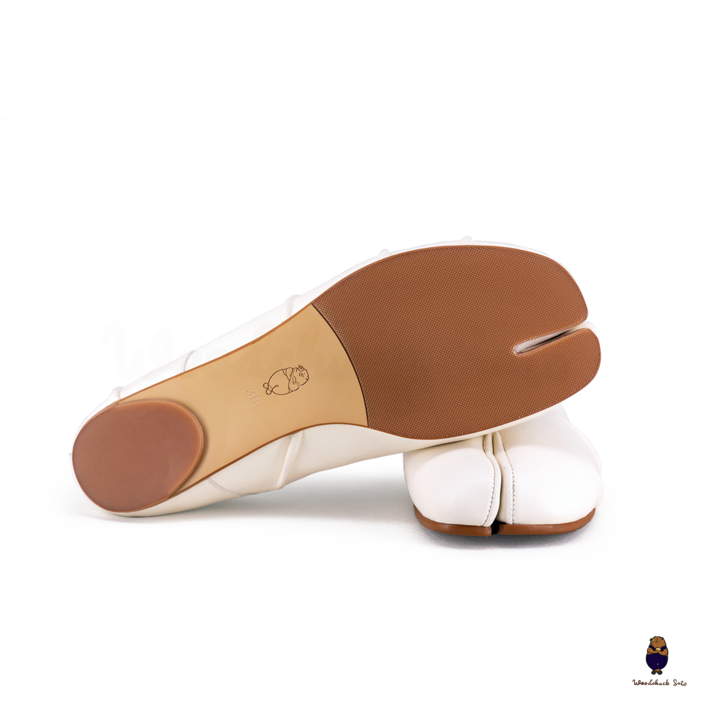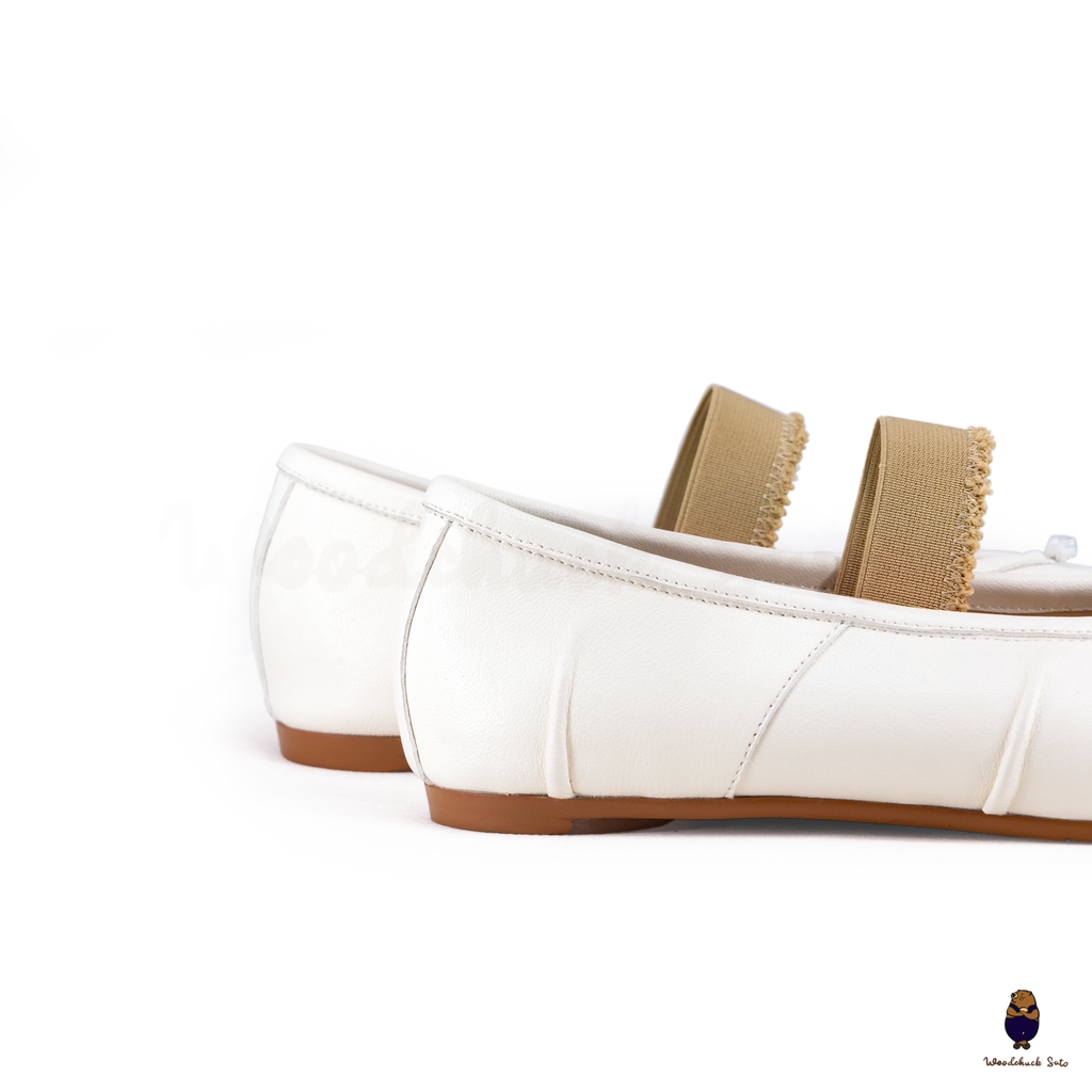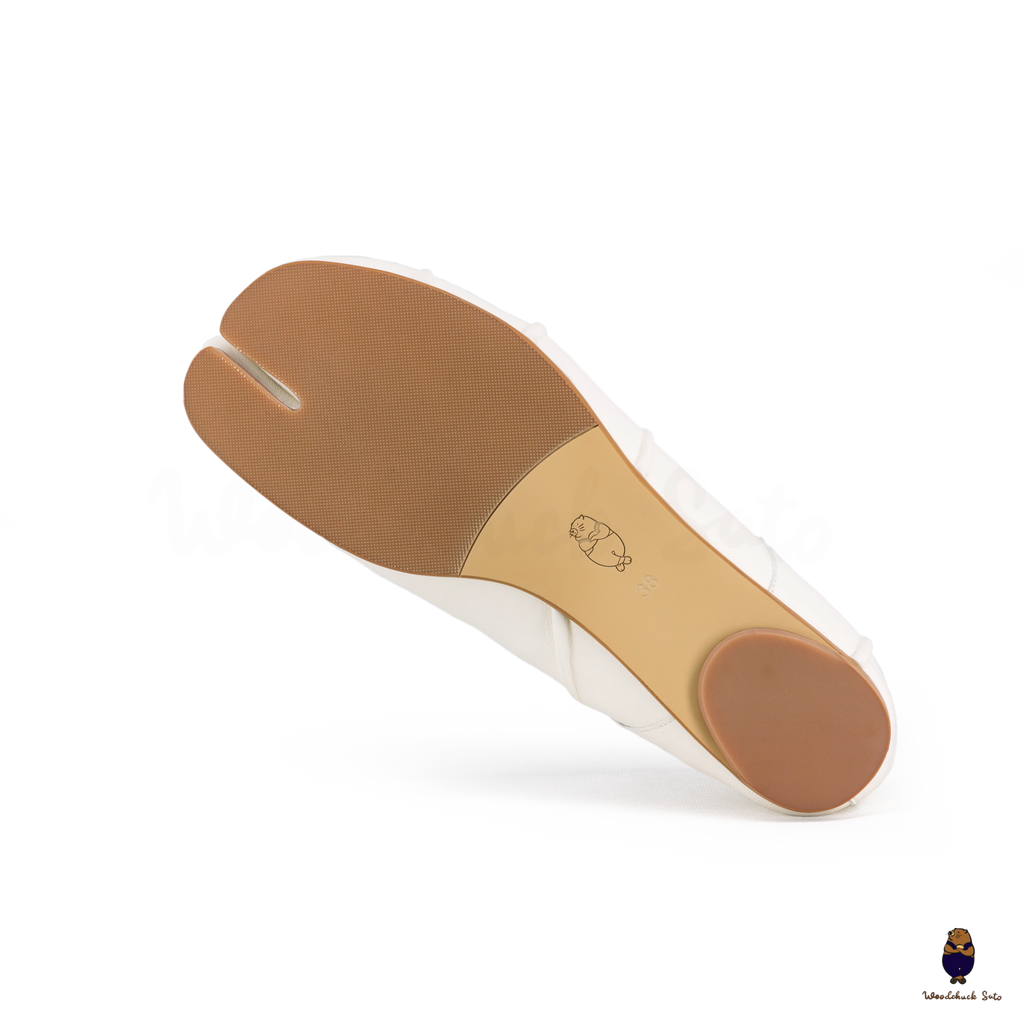 Elegant and contemporary, these white Tabi flats are crafted in supple leather and finished with ruched detailing along the vamp for a soft, textured look. The split-toe design highlights their iconic character, while the beige elastic strap offers a comfortable and secure fit. A versatile style that balances minimalism with artisanal detail, perfect for both casual wear and refined ensembles.