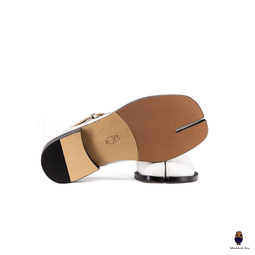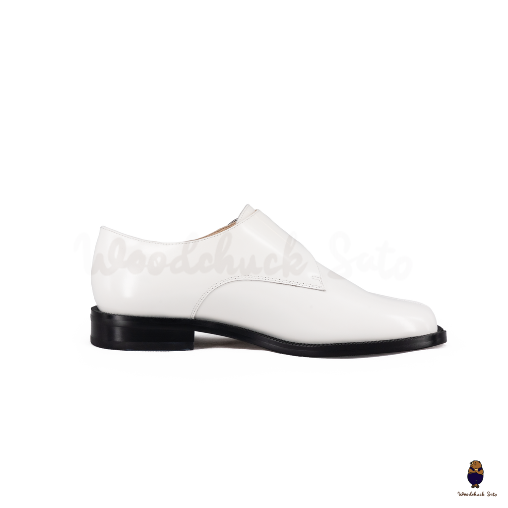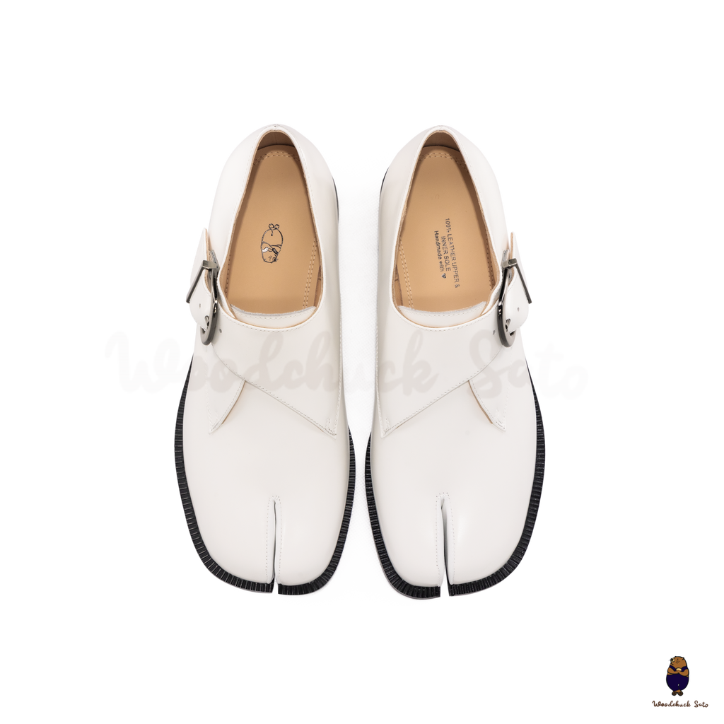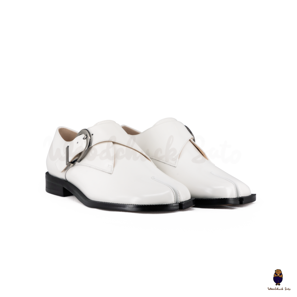 Set on a structured black sole, the shoes combine clarity and precision, offering a fresh interpretation of the traditional monk silhouette. The luminous white finish lends a refined boldness, making this pair an effortless statement piece for both tailored ensembles and elevated everyday looks.