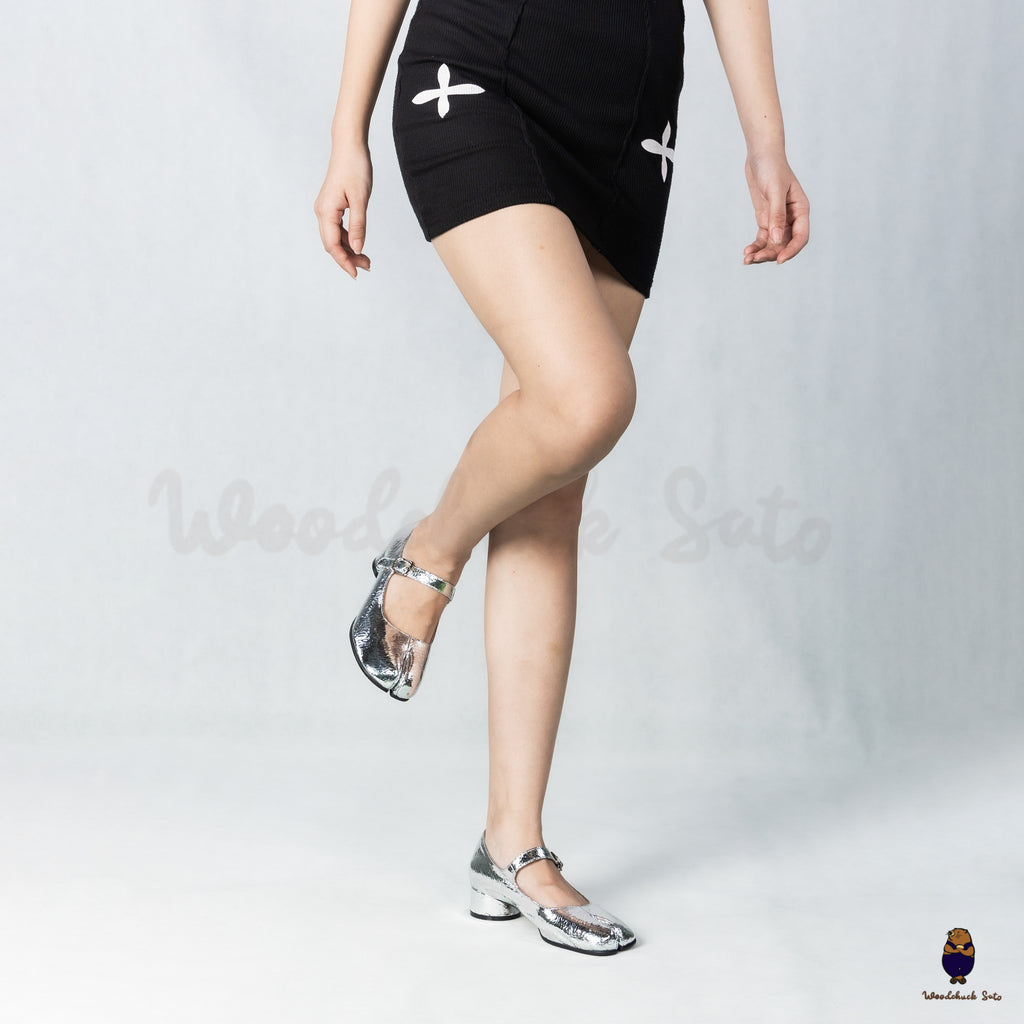 Step into sophisticated shine with the WoodchuckSato Silver Cow Leather Tabi Mary Jane Heels. Crafted from premium silver cow leather, these heels feature the iconic Tabi split-toe design, combined with the timeless elegance of metallic leather. The adjustable strap with a secure buckle ensures a customized fit, while the 3.5cm block heel provides subtle height and lasting comfort. Perfect for adding a modern, chic touch to formal events or elevating casual looks, these handcrafted Tabi Mary Jane heels bring together tradition and contemporary flair.