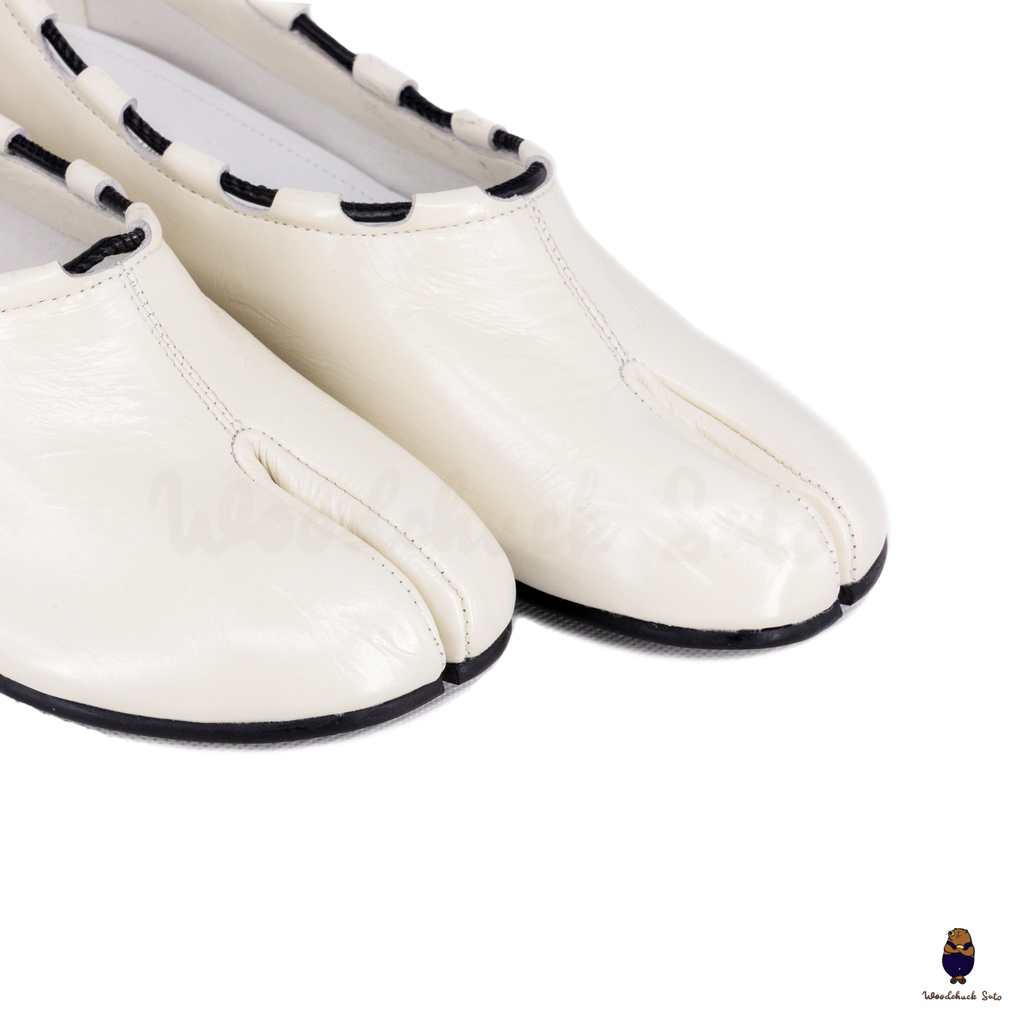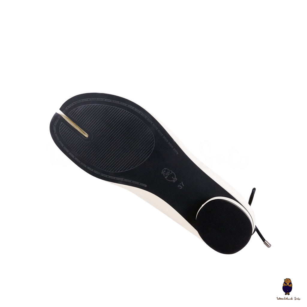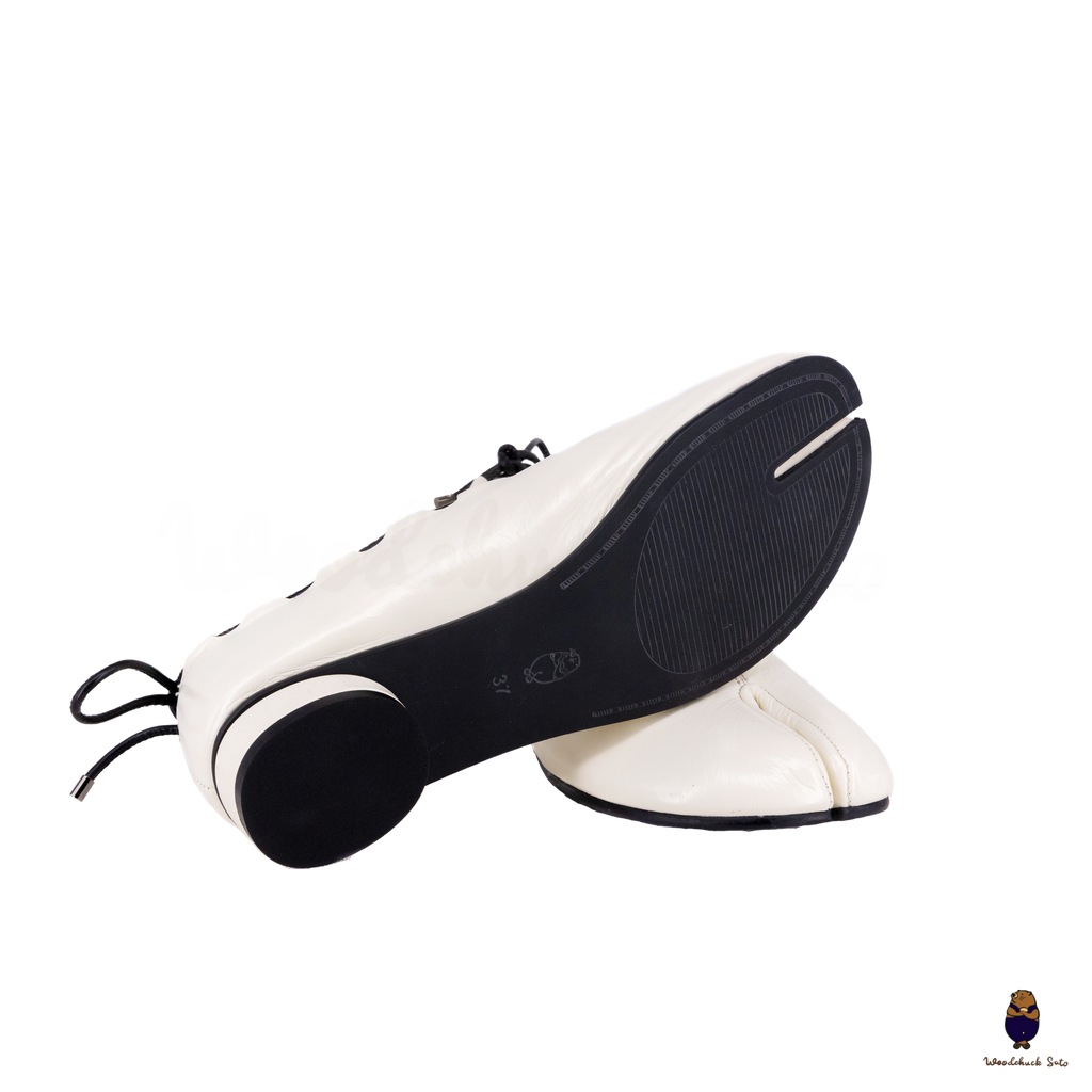 Step into elegance with the WoodchuckSato Ivory white Leather Tabi Mary Jane Heels, a refined take on the iconic split-toe silhouette. Made with supple cow leather for both the vamp and insole, these shoes offer a soft, breathable fit designed for lasting comfort. A distinctive black rope is threaded through the collar and tied into a minimalist loop at the heel, adding a subtle yet structured contrast to the smooth ivory finish. A low-profile heel and durable rubber outsole provide everyday ease and stability.