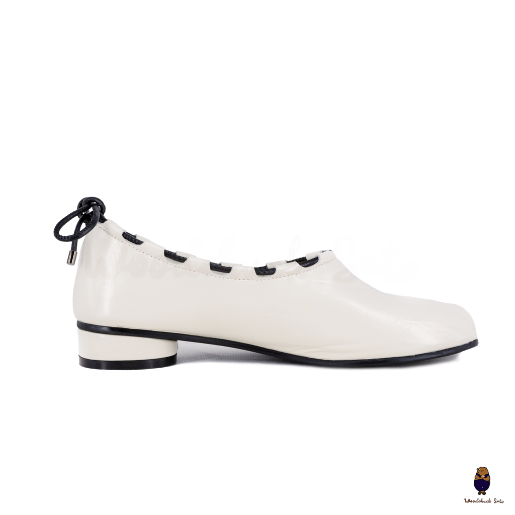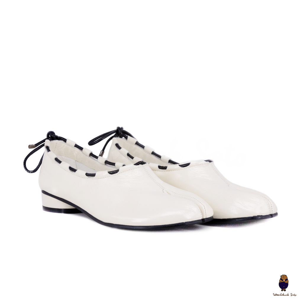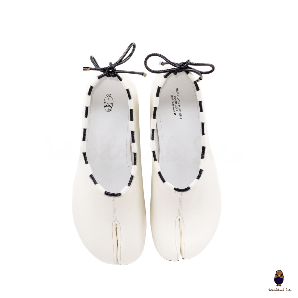 Step into elegance with the WoodchuckSato Ivory white Leather Tabi Mary Jane Heels, a refined take on the iconic split-toe silhouette. Made with supple cow leather for both the vamp and insole, these shoes offer a soft, breathable fit designed for lasting comfort. A distinctive black rope is threaded through the collar and tied into a minimalist loop at the heel, adding a subtle yet structured contrast to the smooth ivory finish. A low-profile heel and durable rubber outsole provide everyday ease and stability.