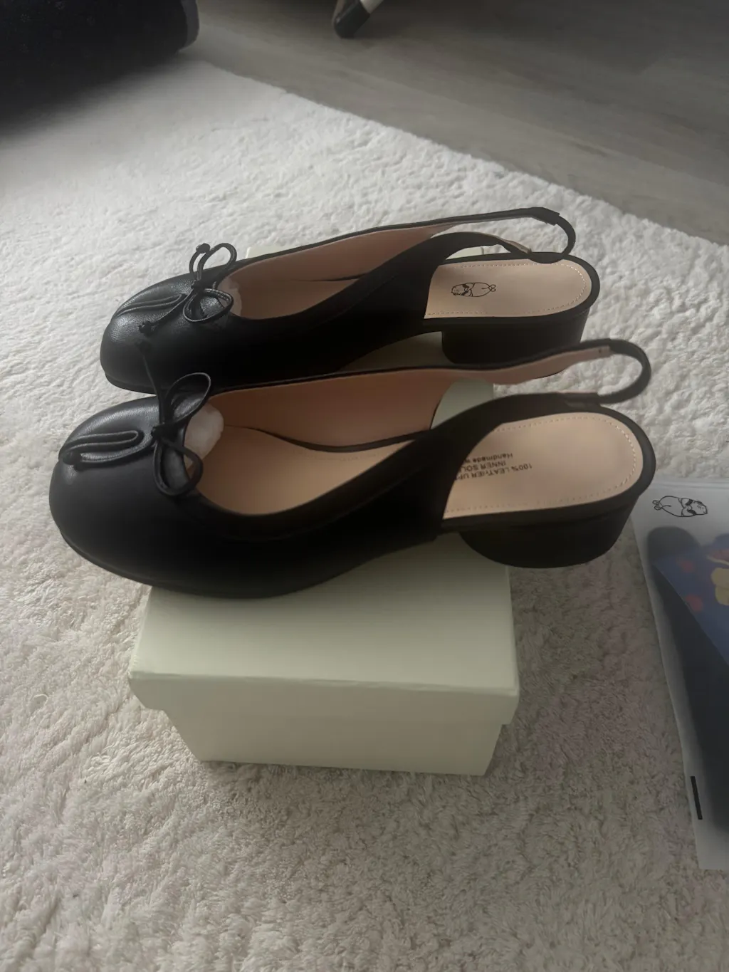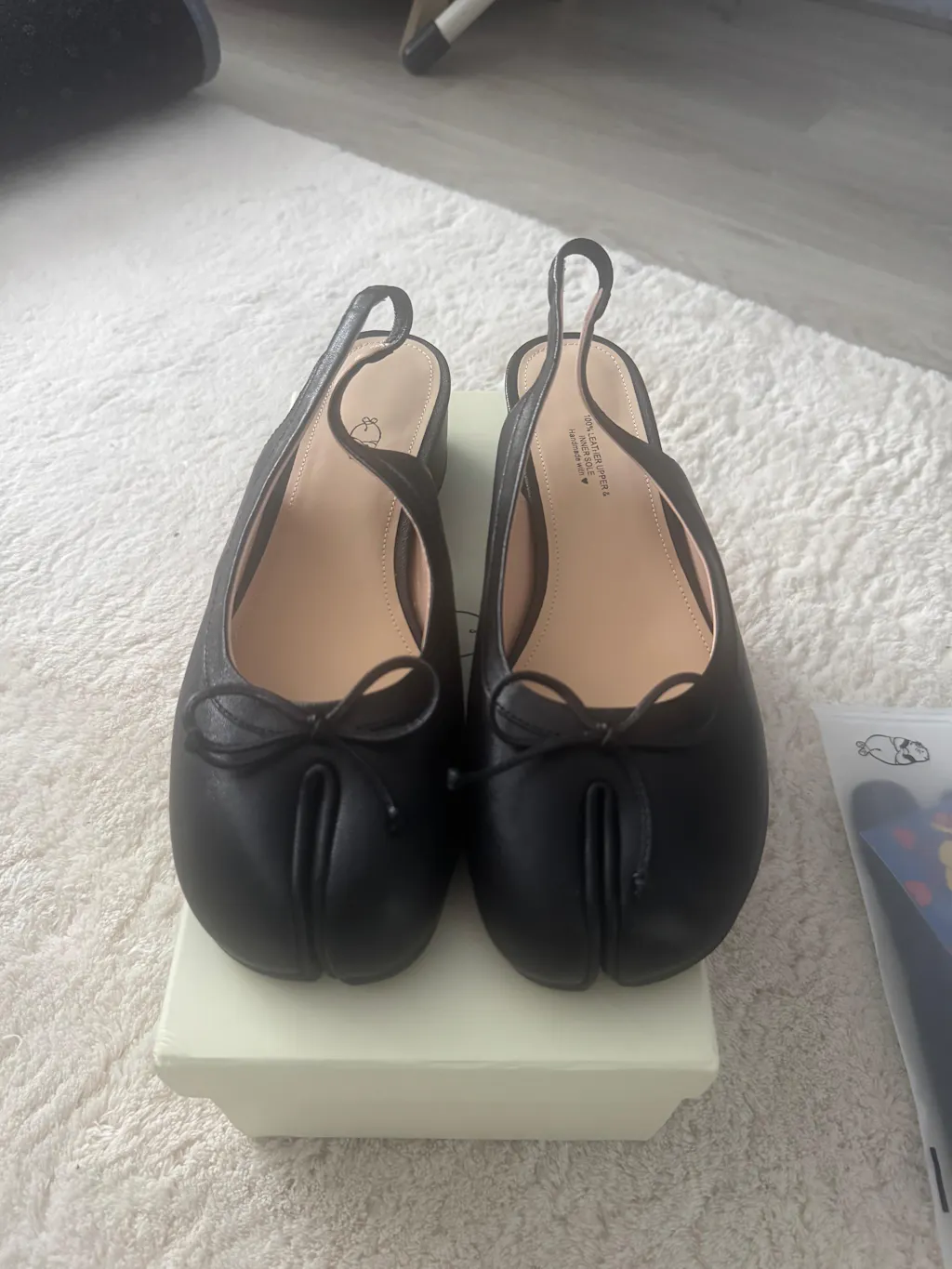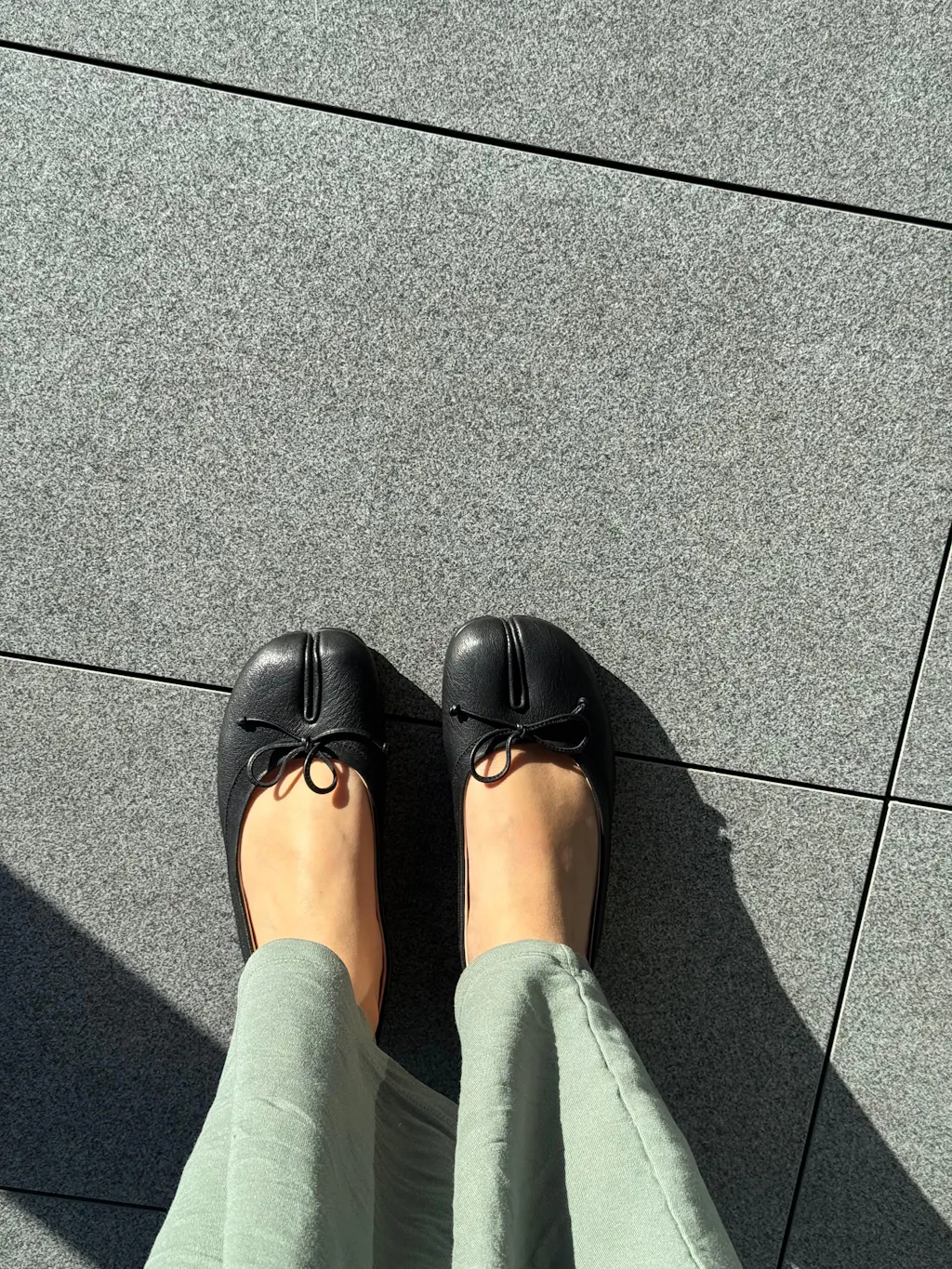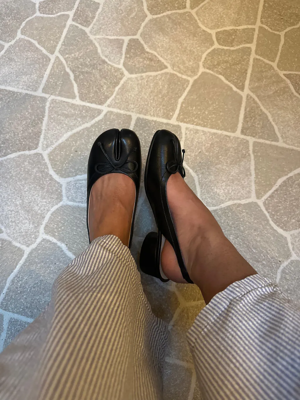 An elegant balance of tradition and ease, these tabi slingback pumps are crafted from supple black cow leather that feels light yet durable. The signature split-toe design is paired with a soft bow for a subtle feminine accent. The open slingback cut creates an airy silhouette, while the discreet elastic band ensures a comfortable and flexible fit that adapts naturally to movement. Finished with a modest block heel, these pumps transition effortlessly from day to evening — refined enough for tailored looks, yet relaxed for casual styling.