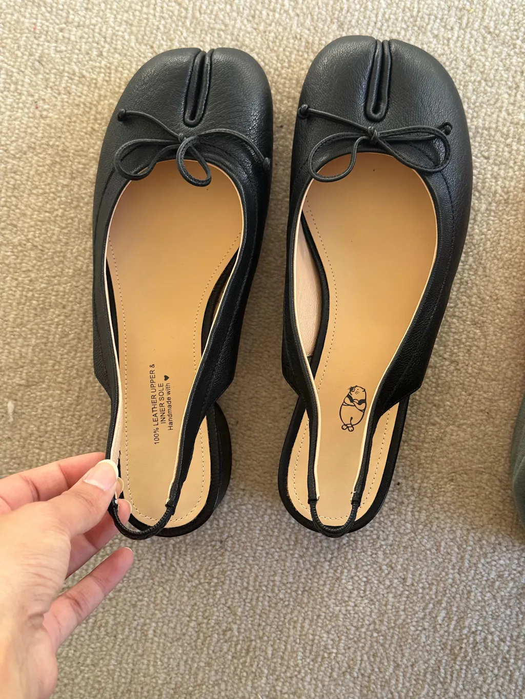Classic Black Cow Leather Slingback Tabi Split-toe Pumps with Bow and Elastic Band