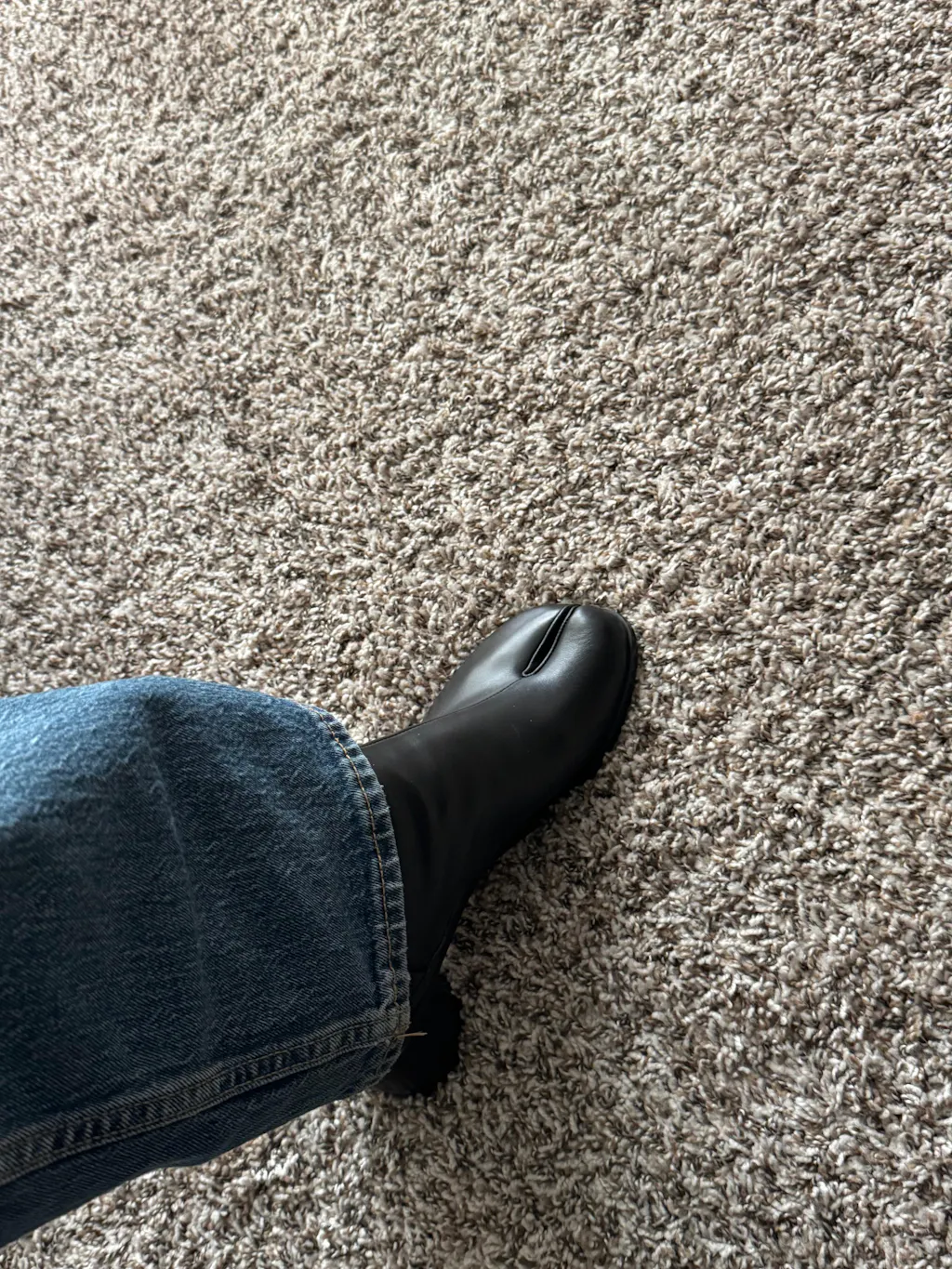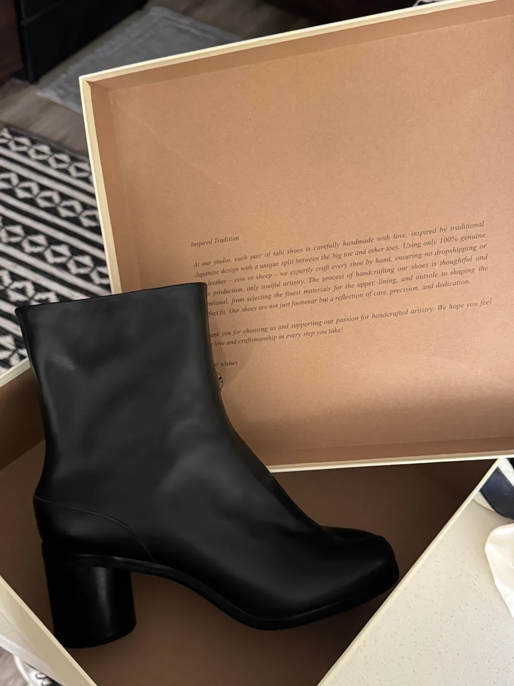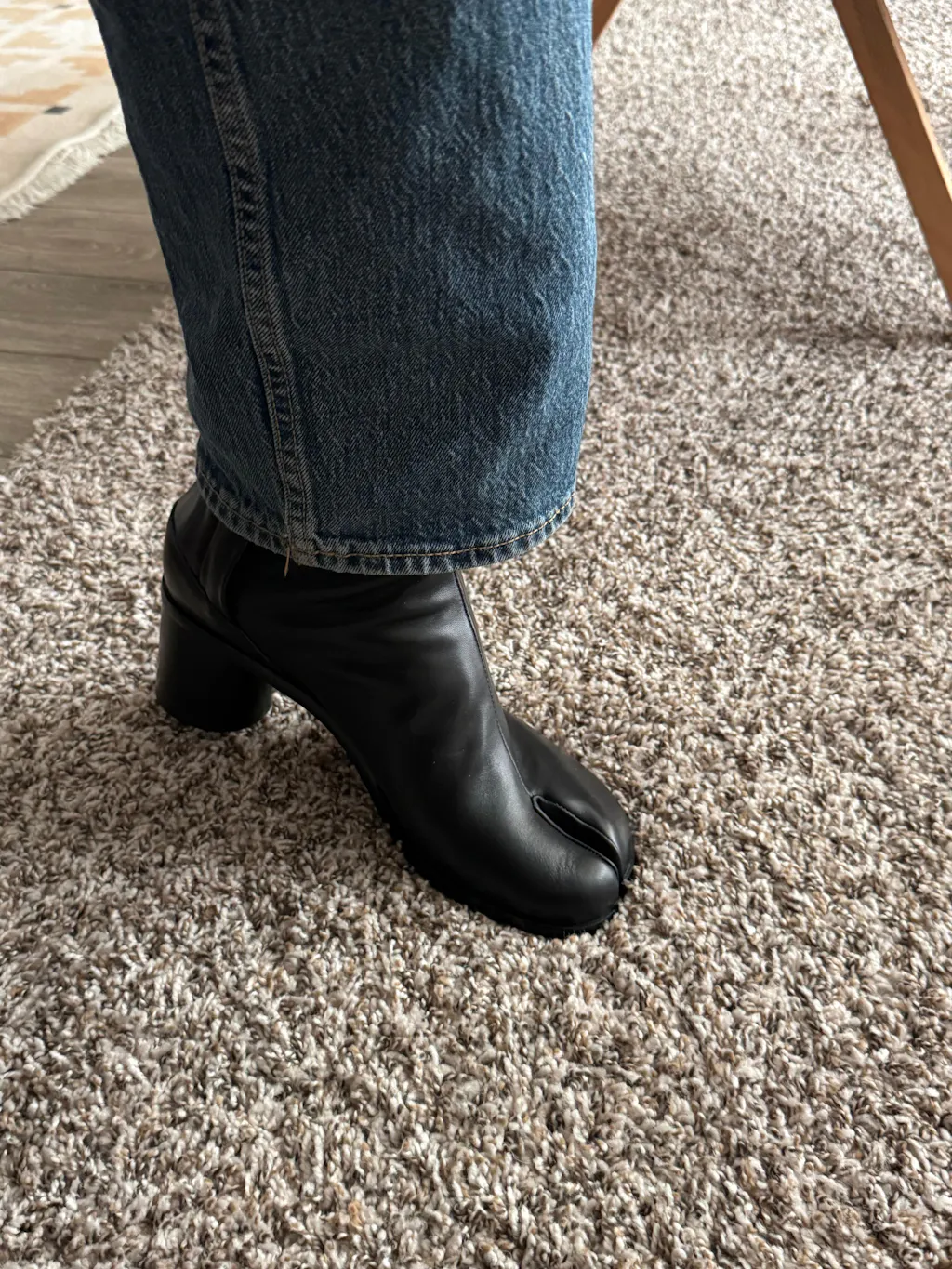Crafted from supple black cowhide leather, these ankle boots reinterpret a timeless silhouette with the signature Tabi split toe. The sleek, minimal design is elevated by a sturdy mid-height block heel, offering both height and comfort for day-to-night wear. A smooth side profile keeps the look modern and versatile, while the high-quality leather molds beautifully to the foot over time. Perfect for pairing with skirts, tailored trousers, or denim, these boots embody refined elegance with an avant-garde edge.