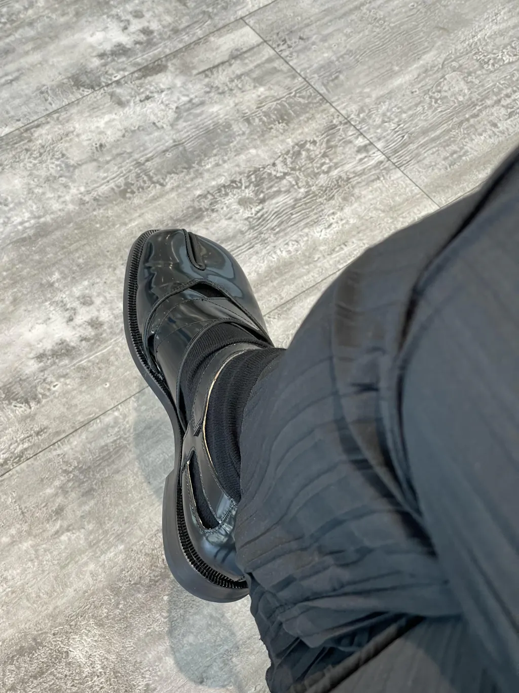 Elevate your footwear with these WoodchuckSato Black Cow Leather Tabi Sandals, featuring a unique closed-toe split-toe design and an elegant strap for a secure fit. Crafted from high-quality cow leather, these sandals offer durability and a polished look, perfect for casual or semi-formal occasions. The sleek black color and minimalist design add versatility, while the strap ensures comfort and stability. These handcrafted sandals combine traditional Tabi aesthetics with modern styling, making them a standout addition to any wardrobe.