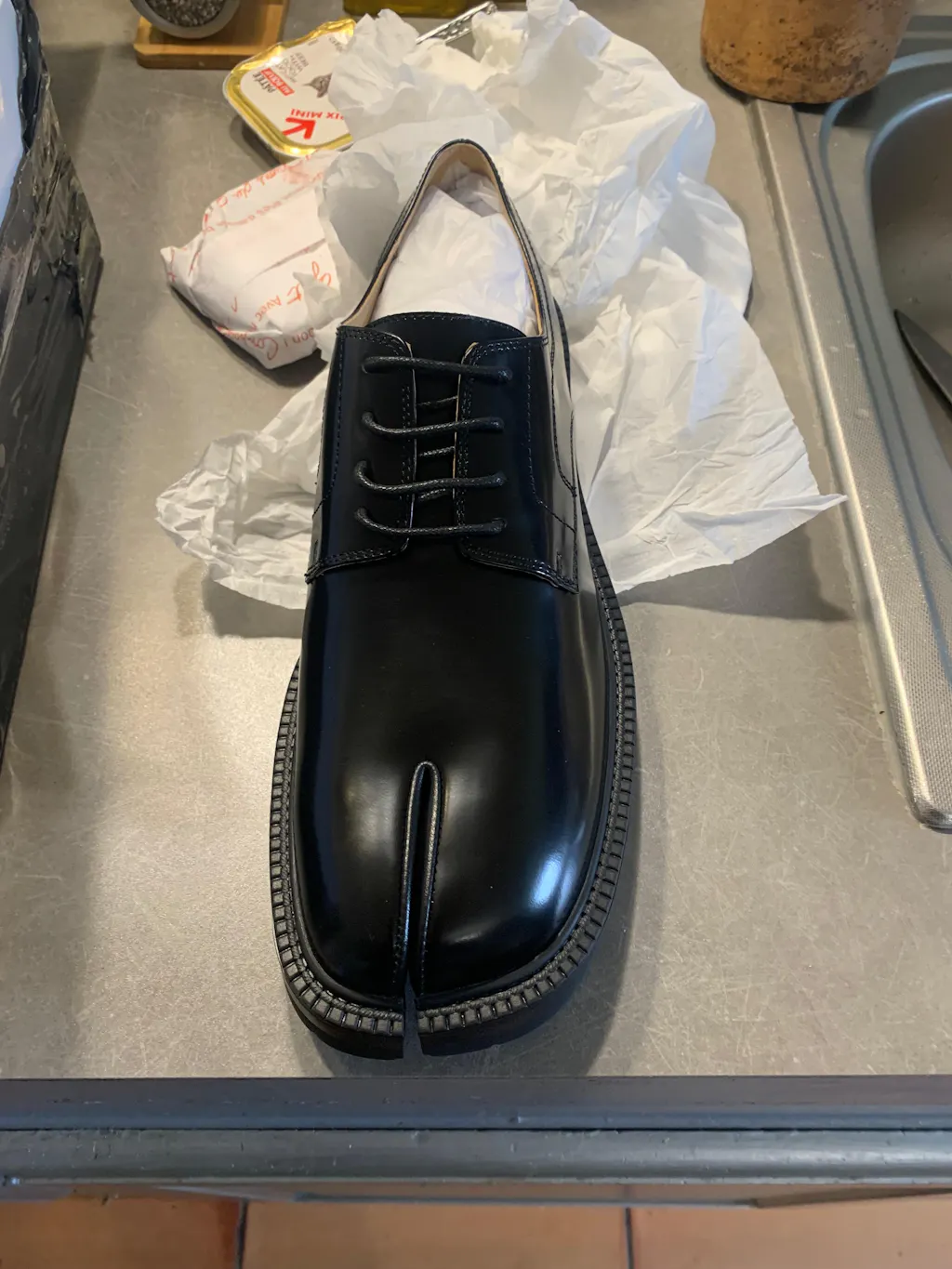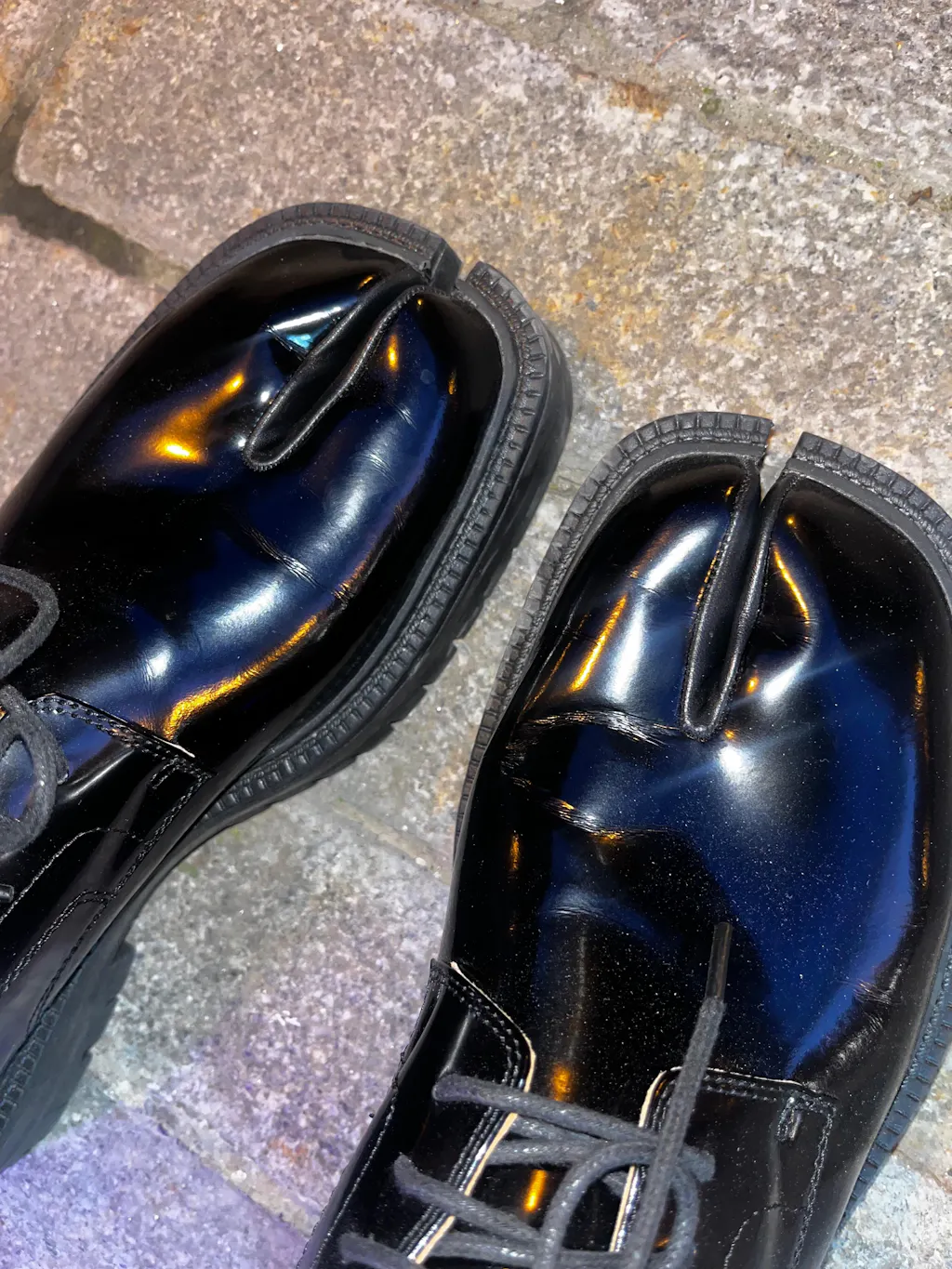 Classic Black Edge-Beaded Cowhide Leather Tabi Split Toe Lace-Up Derby Shoes with Chunky Sole