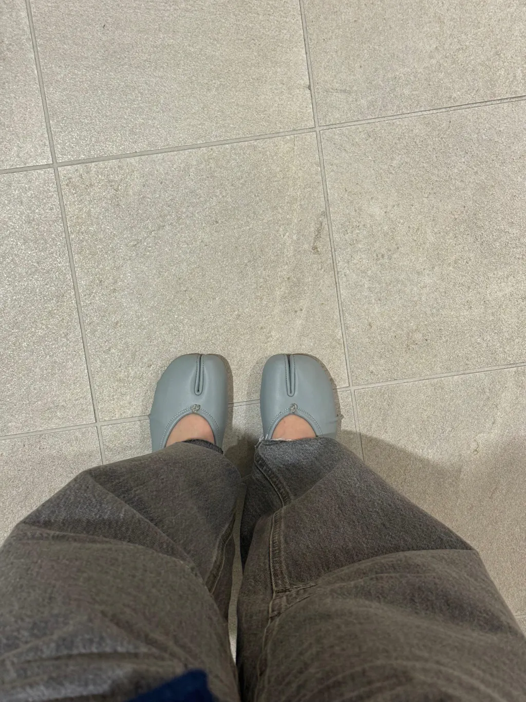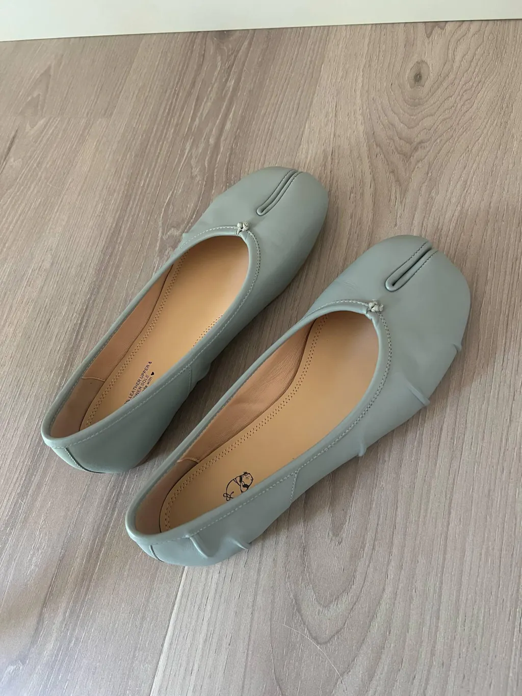 Delicate yet distinctive, these Tabi ballet flats are crafted in supple baby blue leather. The fold detailing along the sides adds gentle texture and movement, while the signature split-toe silhouette lends a bold, iconic touch. Finished with a dainty bow at the vamp and natural-toned sole, they embody a fresh, airy elegance — versatile for both casual styling and refined looks.