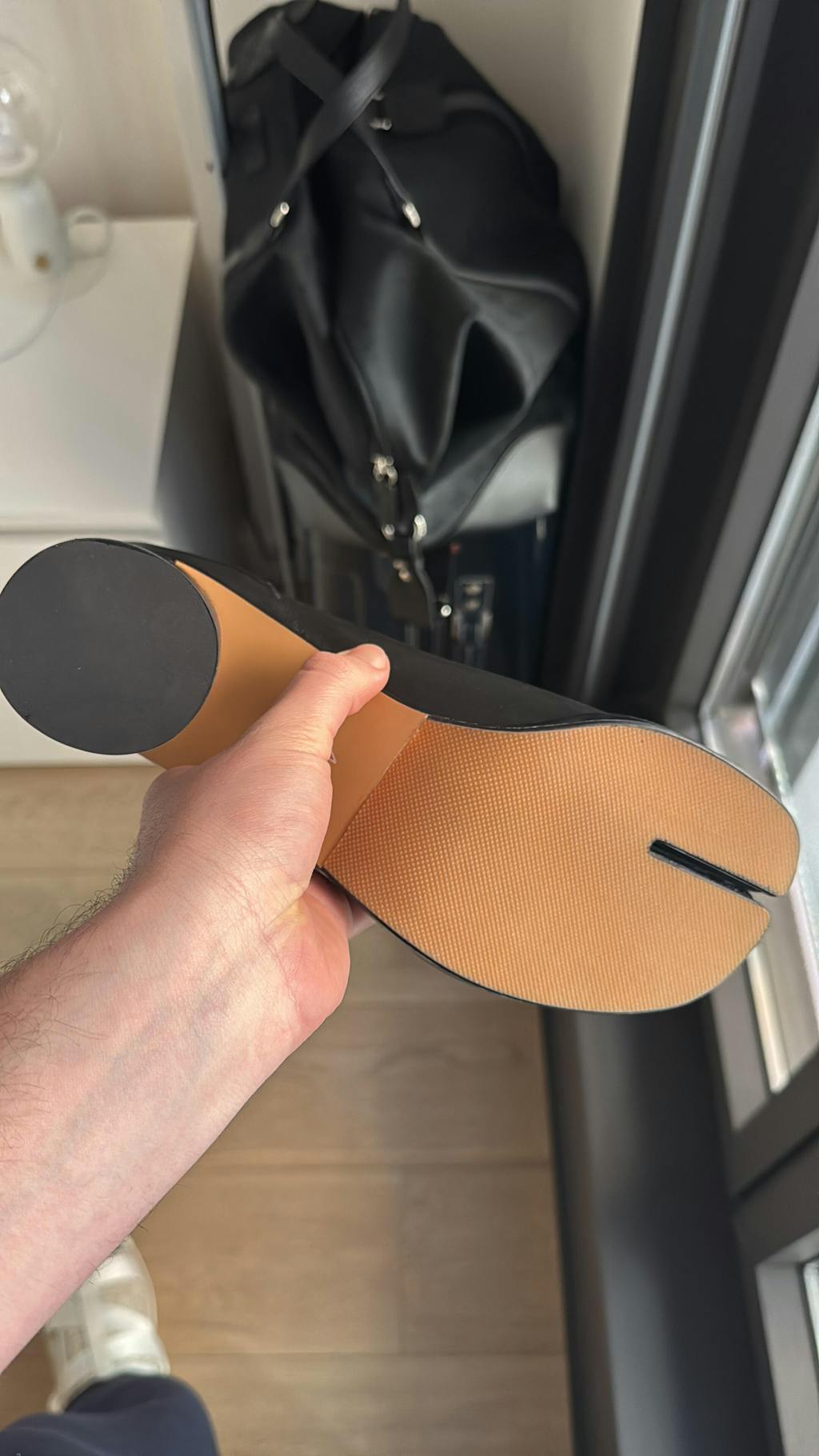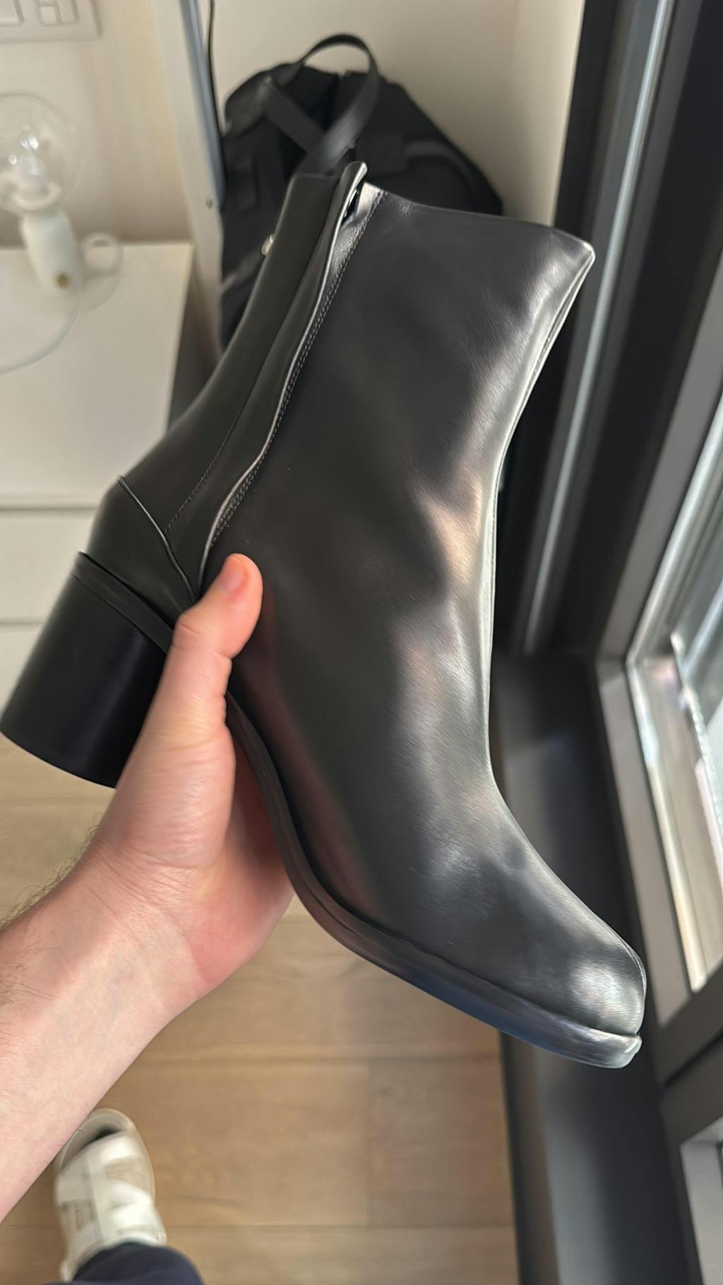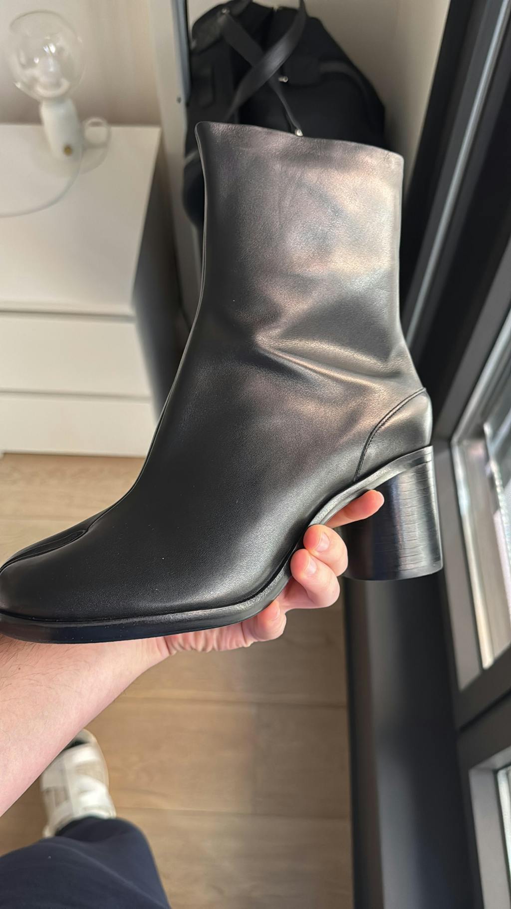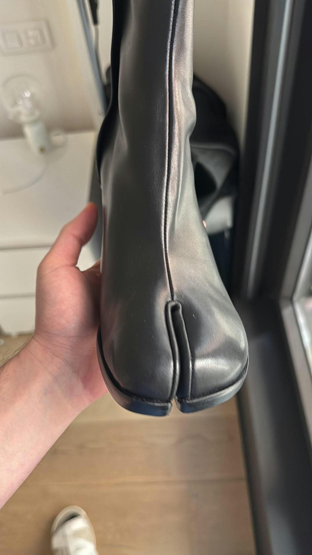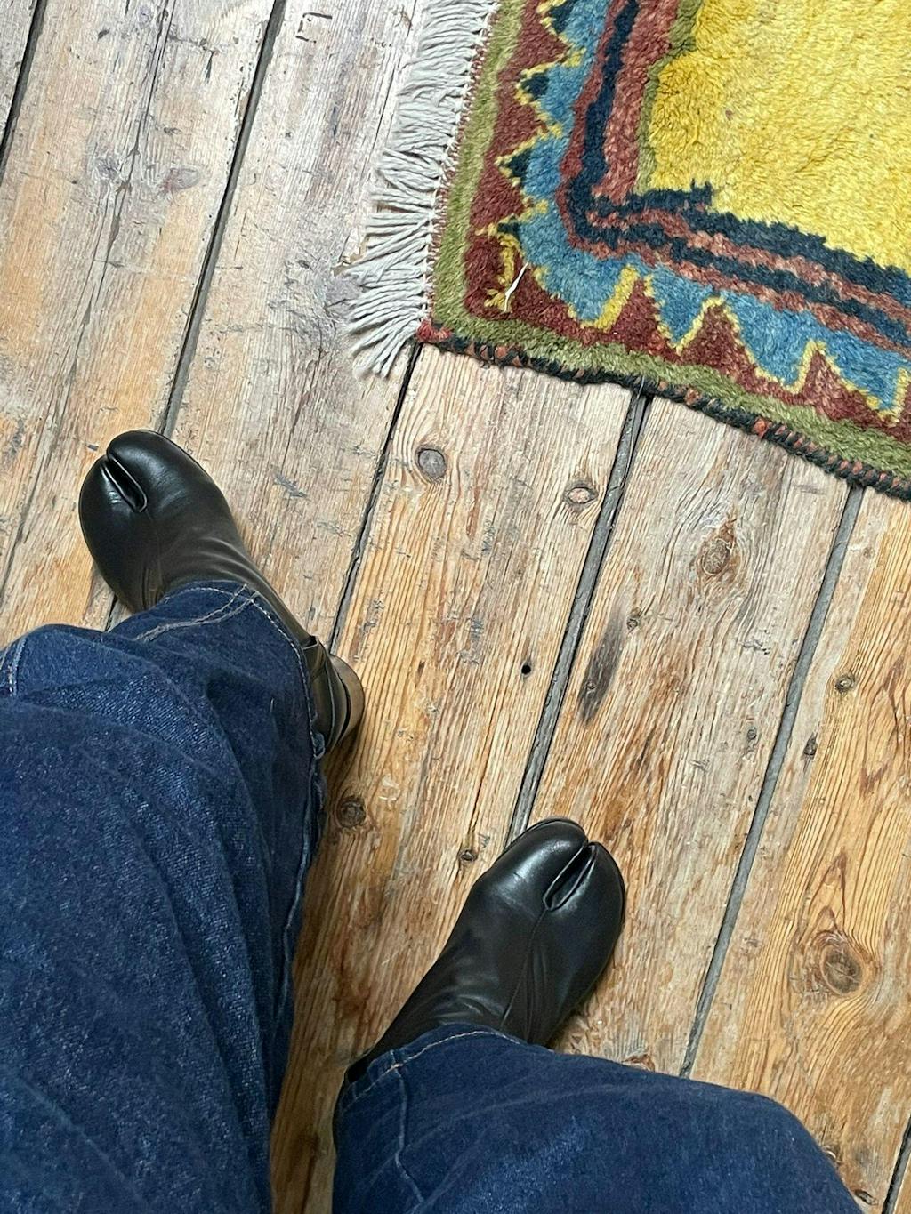 Person wearing Model displaying Black Cow Leather Tabi Split-toe Boots 6 cm Heel