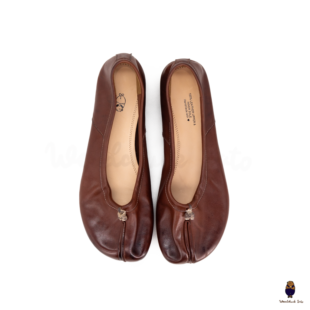 Made from genuine horse leather, the WoodchuckSato Brown Tabi Heels capture both resilience and understated elegance. Horse leather is known for its unique grain and natural toughness, aging gracefully to reveal character over time. The deep brown shade enhances the classic silhouette, while the signature split-toe design adds a distinctive Japanese touch. A 3cm block heel provides comfortable height, making these shoes versatile for both everyday wear and refined styling.