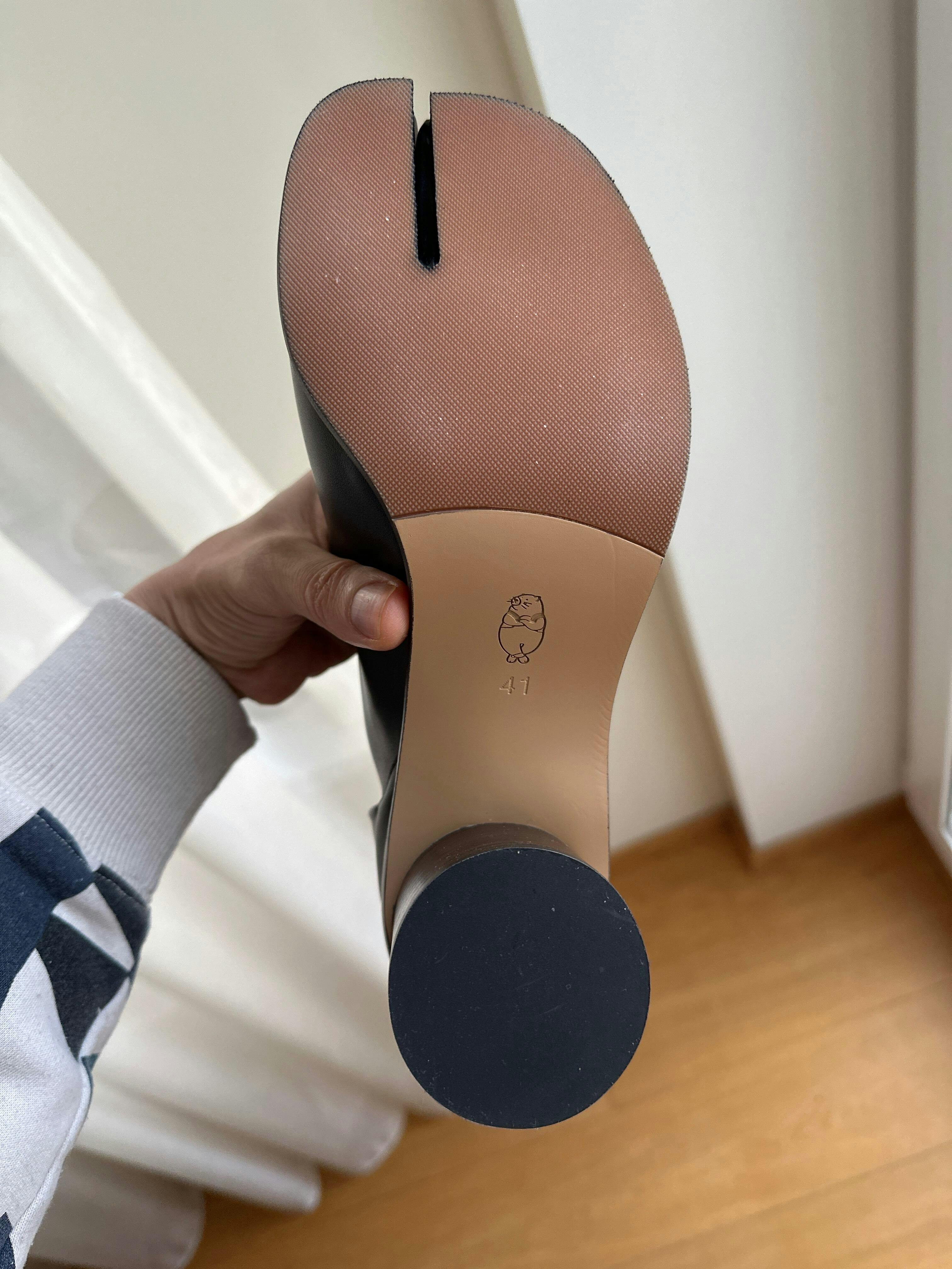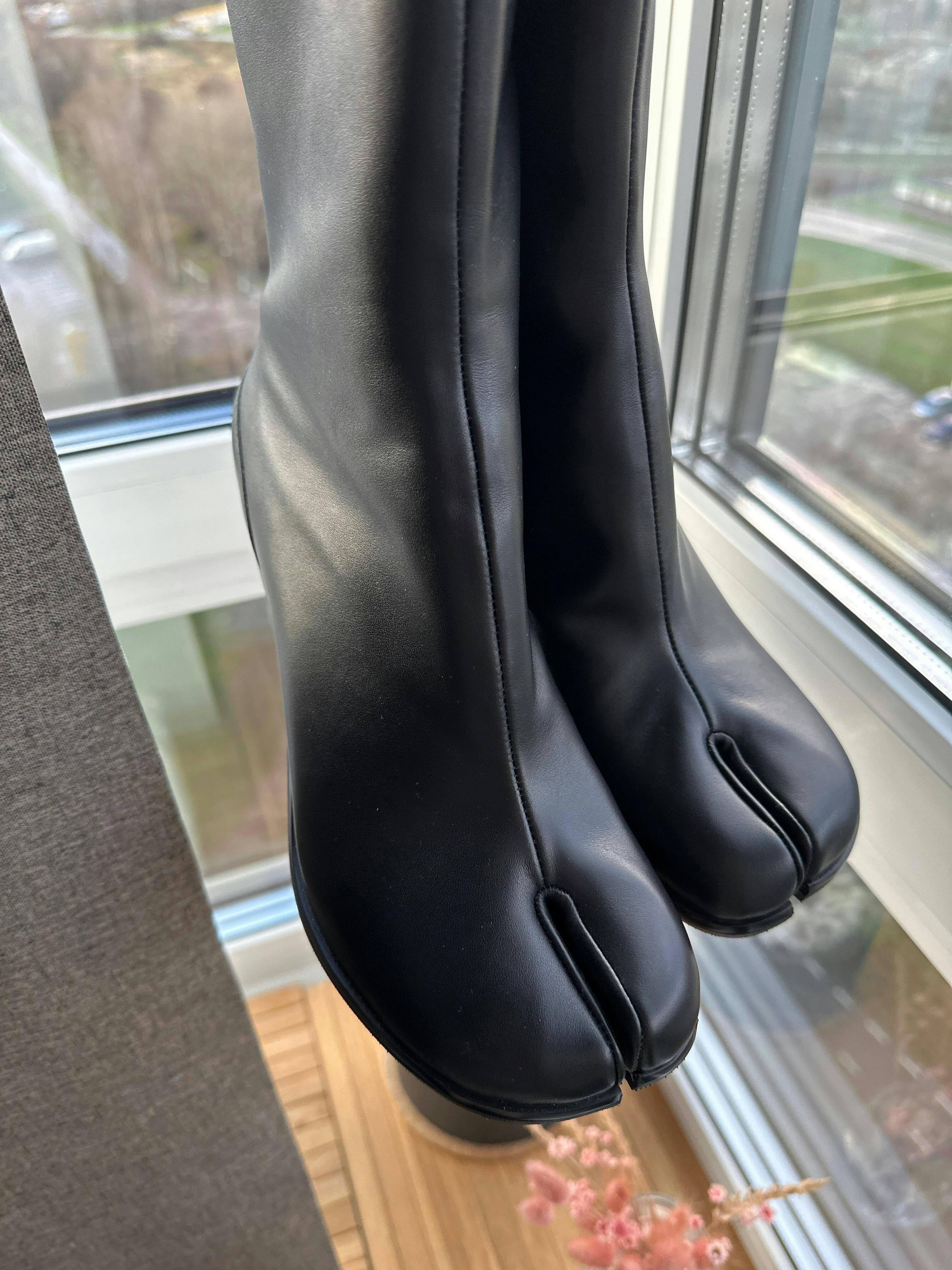 Crafted from supple black cowhide leather, these ankle boots reinterpret a timeless silhouette with the signature Tabi split toe. The sleek, minimal design is elevated by a sturdy mid-height block heel, offering both height and comfort for day-to-night wear. A smooth side profile keeps the look modern and versatile, while the high-quality leather molds beautifully to the foot over time. Perfect for pairing with skirts, tailored trousers, or denim, these boots embody refined elegance with an avant-garde edge.