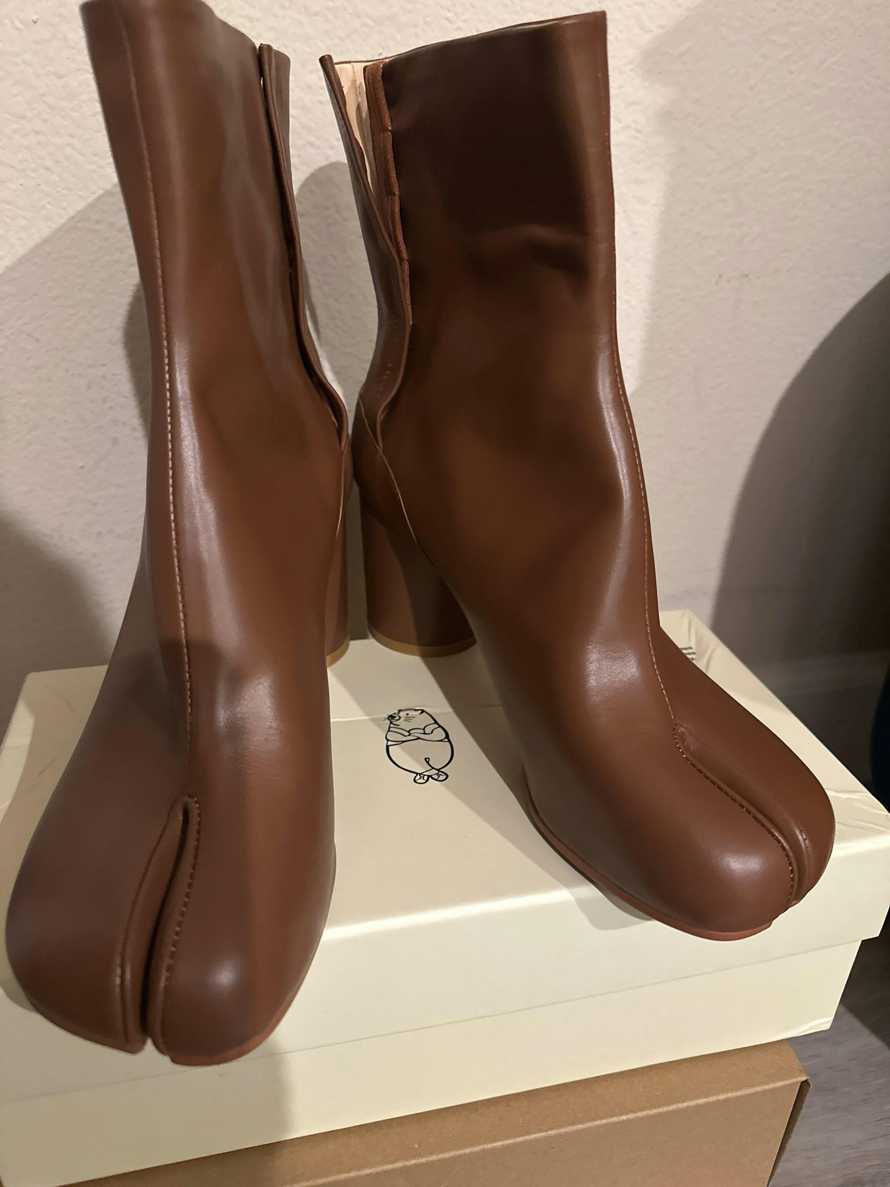 Crafted from supple brown cow leather, these Tabi ankle boots bring warmth and versatility to the iconic split-toe silhouette. The clean ankle-high cut is paired with an 8 cm block heel, offering height with stability and comfort. Minimal stitching keeps the profile sleek, while the natural tone makes this pair easy to style with both neutral palettes and bold contrasts. A timeless design that blends artisanal craftsmanship with everyday sophistication.