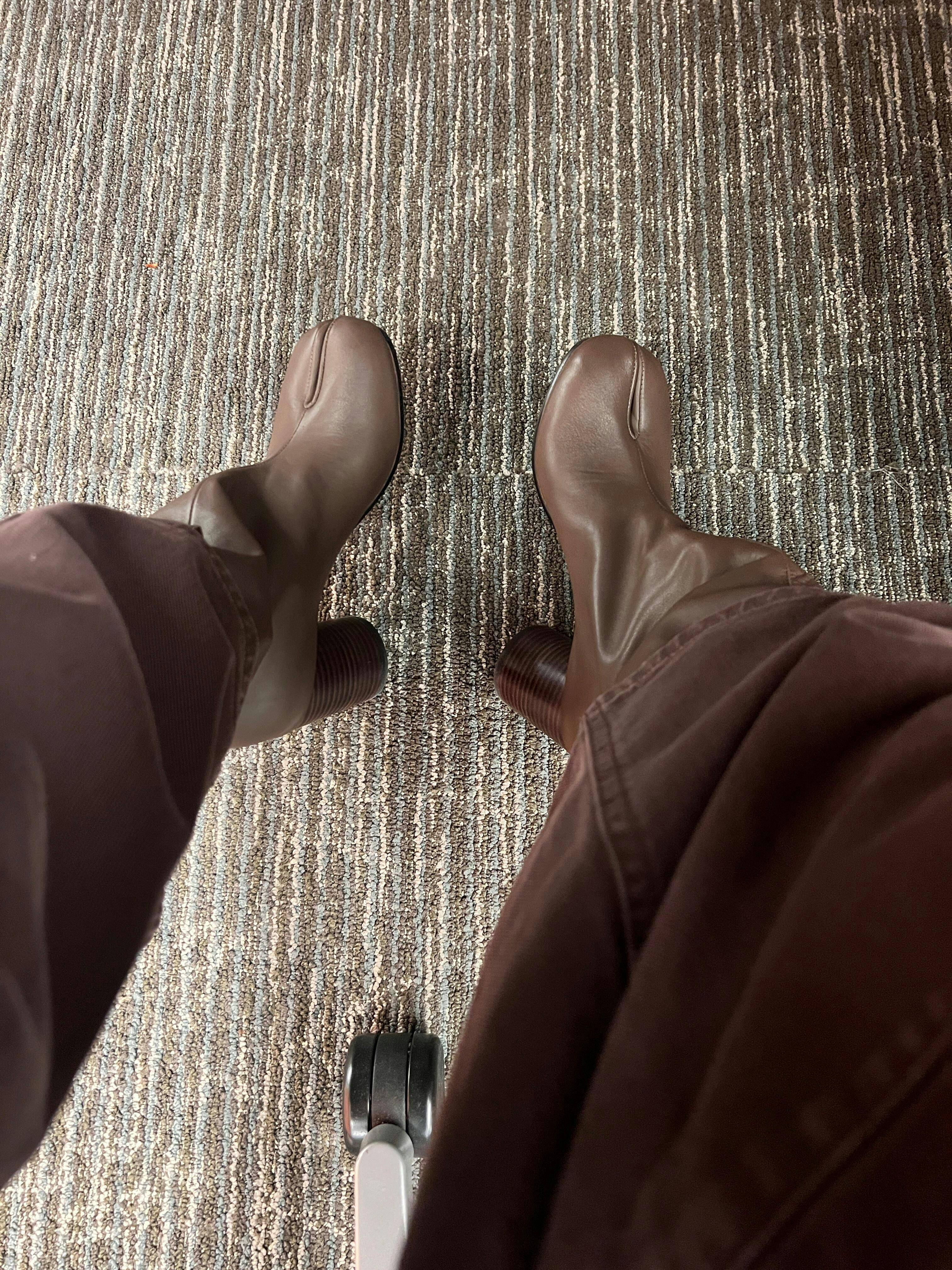 Crafted from smooth mocha brown cow leather, these Tabi ankle boots add a modern twist to the signature split-toe silhouette with a distinctive drawstring collar. The adjustable top allows for a customized fit, creating a subtle slouch effect that blends ease with elegance. Set on an 8 cm stacked heel, they deliver confident height while maintaining stability. With their warm mocha hue and unique design, this pair is perfect for elevating everyday looks or adding character to refined ensembles.