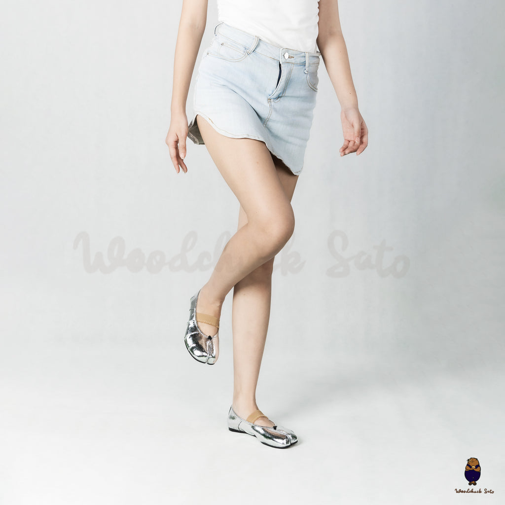 Bold yet refined, these Tabi mules are crafted in cracked metallic silver leather, bringing a modern edge to the classic silhouette. The ruched detailing across the vamp adds depth and texture, while the signature split-toe design enhances their artisanal character. Balanced with a tan elastic strap for comfort and stability, these open-back mules are the perfect statement piece — versatile enough to pair with casual denim or elevate an evening look with a touch of shine.