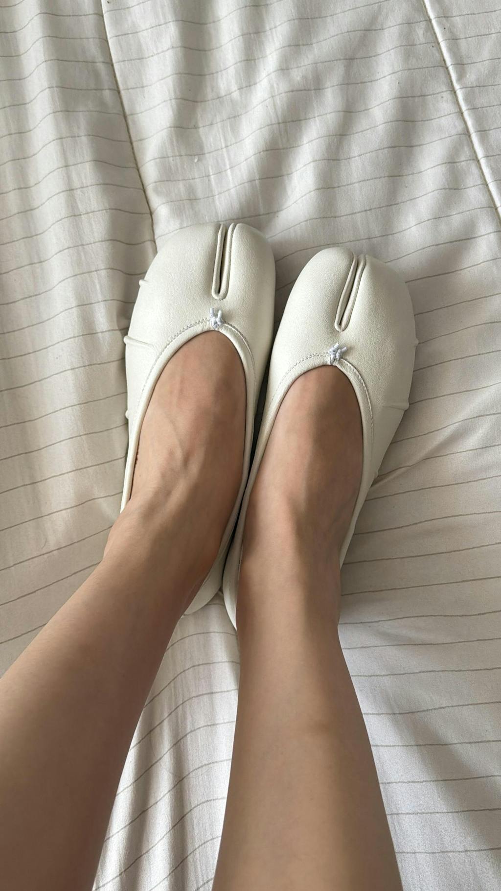 Clean, classic, and modern. These white leather Tabi ballet flats feature fold detailing along the vamp, giving gentle texture and depth to the minimalist silhouette. The iconic split-toe design adds a bold, distinctive character, while the delicate bow at the vamp softens the look with elegance. A timeless choice, perfect for both casual and refined ensembles.